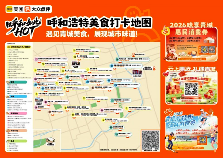 跨年热度尚未消退,一月的文旅活动便已无缝衔接,以多点开花之势,持续拉升冬季旅游的热度,实现了名副其实的新年“开门红”,为即将到来的新春佳节积蓄能量。第四届哈素海冬捕节暨“呼和如此HOT”来青城过大年系列活动在激昂的锣鼓声中破冰启幕,“深呼吸”大湾区旅行商呼和浩特文旅资源踩线活动相继展开,《2026年呼和浩特美食打卡地图》正式上线,“2026来内蒙古过大年”春节系列活动在大黑河军事文化乐园燃情启幕……